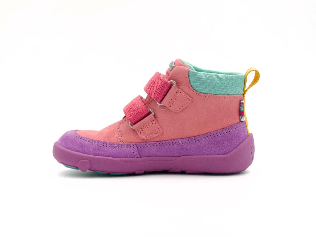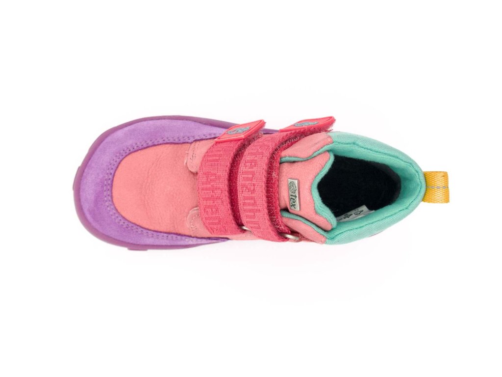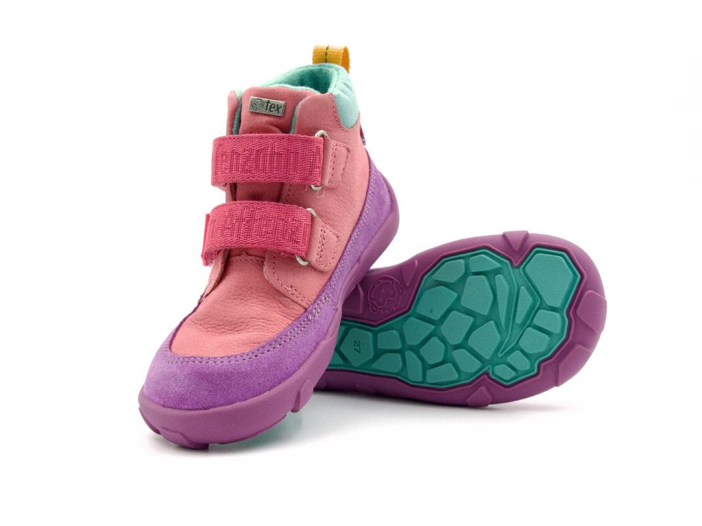 Dětské kotníkové barefoot boty, které si děti zamilují nejen pro své vlastnosti, ale také krásný barevný vzhled. Hladká kůže je doplněná okopem z broušené kůže, který chrání špičku před rychlým opotřebením. Díky membráně zůstávají nožky v suchu i při dešti a lehká fleecová podšívka poskytuje dostatek tepla pro chladnější dny.